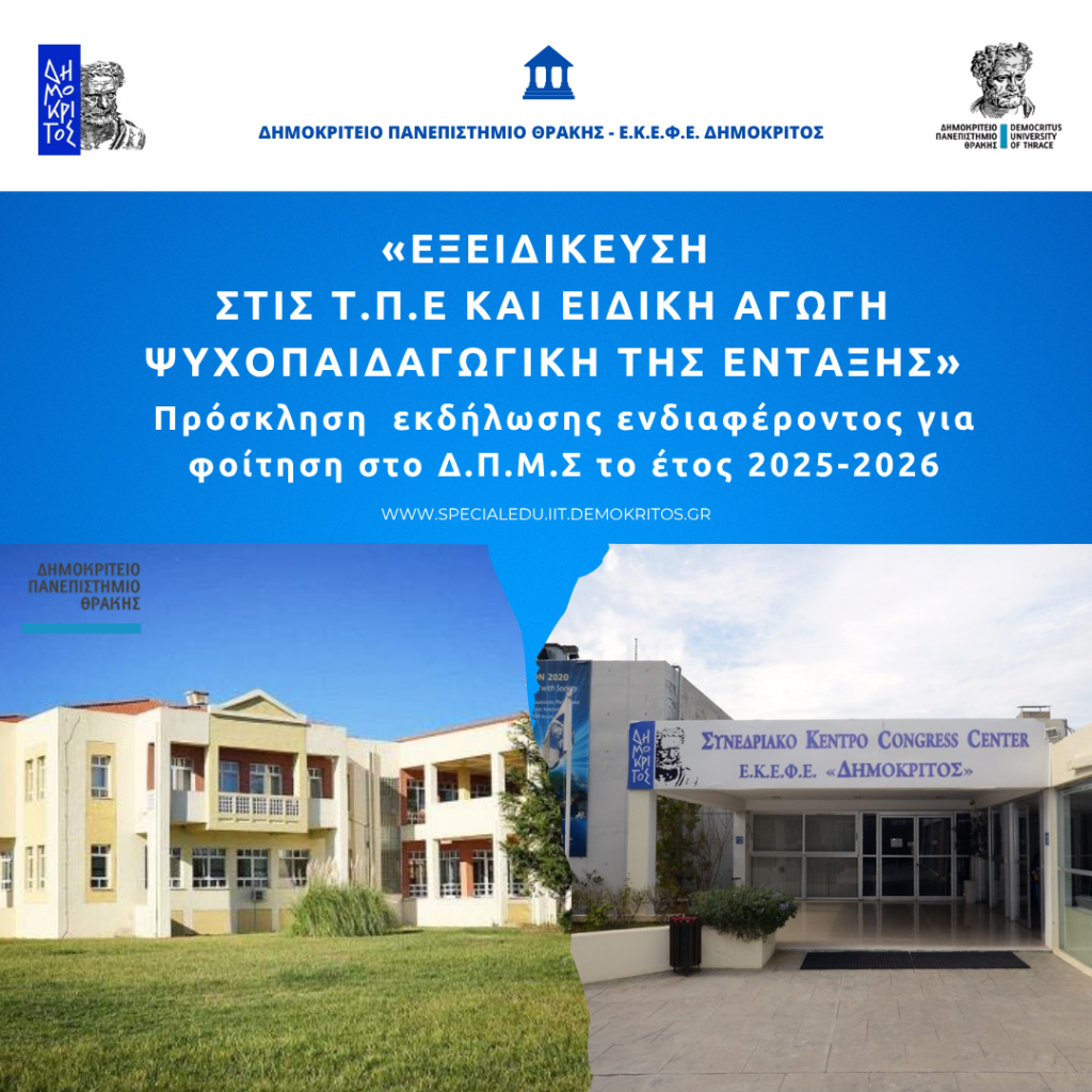 Το Τμήμα Ανθρωπιστικών Σπουδών του Δημοκριτείου Πανεπιστημίου Θράκης σε συνεργασία με το Ινστιτούτο Πληροφορικής & Τηλεπικοινωνιών του Ε.Κ.Ε.Φ.Ε. «Δημόκριτος» θα λειτουργήσει για το ακαδημαϊκό έτος 2025 – 2026 το Δ.Π.Μ.Σ. με τίτλο «ΕΞΕΙΔΙΚΕΥΣΗ ΣΤΙΣ Τ.Π.Ε. ΚΑΙ ΕΙΔΙΚΗ ΑΓΩΓΗ – ΨΥΧΟΠΑΙΓΩΓΙΚΗ ΤΗΣ ΕΝΤΑΞΗΣ».